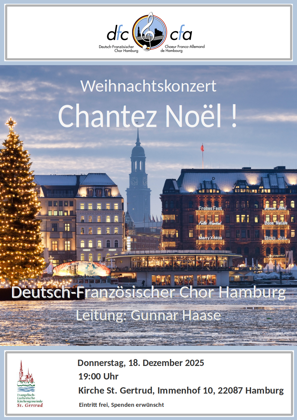 Nächster Auftritt: Am 18.12.2025 um 19:00 findet das Weihnachtskonzert "Chantez Noël" in der Kirche St. Gertrud statt